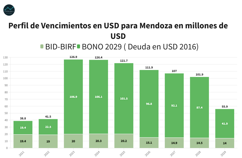 La provincia, gobernada actualmente por el radical cambista Rodolfo Suárez, recién comenzó a transitar un lustro de vencimientos por encima de 100 millones de dólares cada año. El actual y el próximo serán los peores, alcanzando 126 millones de esa moneda cada uno. En 2029 bajará a poco más de 50 millones, pero incluso entonces continuará siendo superior a los vencimientos pautados para 2021 y 2022, cuando ya se notaba el impacto sobre la distribución en la provincia. Más de una década perdida, y mucho más por lamentar. El CEFI lo volcó a un gráfico elocuente:
