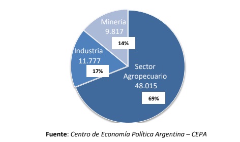 Para contrastar, CEPA consigna que la industria representa el 18,9% del empleo en el sector privado registrado: 1.188.420 trabajadores. Cifra similar puede visualizarse en Comercio y Reparaciones 1.184.367 trabajadores (18,8%). Con menos incidencia, pero sin embargo superando al agro, la rama Transporte genera 561.107 puestos de trabajo registrados (8,9%), y la Construcción representa el 7,3% (aquí se trata de otro sector con elevado nivel de informalidad), con 456.151 trabajadores.