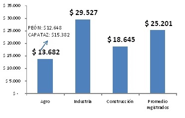 No sólo el empleo es escaso. Además las remuneraciones son mezquinas. Según los datos del Sistema Integrado Previsional Argentino (SIPA) a septiembre de 2017 los trabajadores del agro percibían 13.682 pesos mensuales, con oscilaciones entre los 12.648 pesos de un peón y los 15.382 de un capataz, mientras que la línea de pobreza de la última publicación del INDEC, válida para el Gran Buenos Aires, arrojó un valor de 15.607 pesos para un hogar tipo de cuatro integrantes. Con un solo sueldo, todas las familias rurales son pobres. Eso debe ser lo que enamora a Macrì. El cuadro muestra el contraste con la industria, la construcción y el promedio para el conjunto de los trabajadores registrados del sector privado.