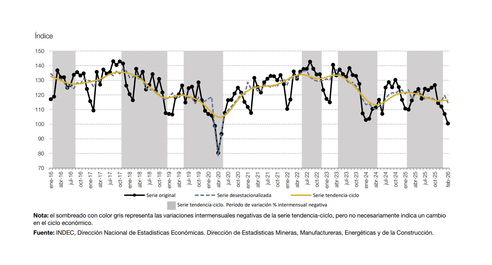 De acuerdo a esa estimación, se trató del octavo mes consecutivo de caídas interanuales en términos absolutos. Incluso tomando la serie desestacionalizada, que permite suavizar la comparación considerando componentes irregulares, fue el quinto de los últimos ocho meses con retrocesos en la producción respecto de iguales periodos de 2025.
