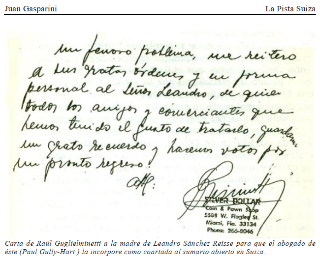Allá, mientras su banda de cómplices detenida en Zürich iba a juicio, Sánchez Reisse hizo circular que, si después de cumplir su pena, era entregado a la Argentina, no debía ignorarse que él conocía las peripecias de esos baúles. “La señal iba dirigida a sus superiores, Guglielminetti y Guillermo Suarez Masón”, según Gasparini (El Testigo Secreto, 1999).De acuerdo al autor, Guglielminetti guardó una de las cinco llaves de esas cajas de seguridad, aunque una parte habría quedado en Francia, según el corresponsal de Clarín Enrique Oliva.