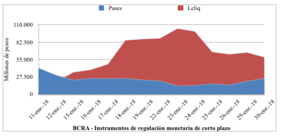 Las Lebacs y el pase son los instrumentos que utiliza el Central para retirar del mercado los pesos que paga al tesoro a cambio de los dólares originados en la deuda externa. A través de la Comunicación A 6426, se agregó otro instrumento de esterilización, la Letra de Liquidez (Leliq), que al no pagar ingresos brutos, contar con mercado secundario y vencer a los 7 días, vuelve más ágil el modelo de timba financiera y más pesada la deuda del Banco Central. La autoridad monetaria sostiene que ese pasivo es manejable. Sin embargo, la reducción del margen de maniobra es inocultable. La suma de pases, Lebac y Leliq asciende a 1.2 billones de pesos, aproximadamente un 104% de las reservas internacionales.