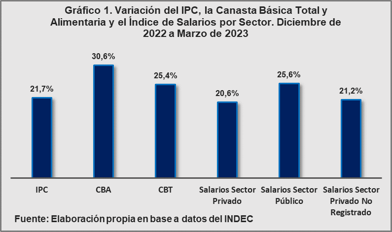 El IPC se incrementó en un 8,4% en abril, con lo que llegó a una variación acumulada en lo que va del año del 32%, y una del 108,8% frente al nivel del mismo mes en el año anterior. Dentro del IPC, el rubro Alimentos y Bebidas no Alcohólicas varió un 10,1%, La Canasta Básica Alimentaria alcanzó un aumento del 7,3% en abril, mientras que el de la Canasta Básica Total llegó al 6,3%. A diferencia de lo que ocurre con el IPC, son incrementos menores con respecto al mes de marzo, pero eso no quita que sigan representando un peso cada vez mayor sobre el salario. En los meses anteriores, sus aumentos estuvieron por encima de los del IPC.