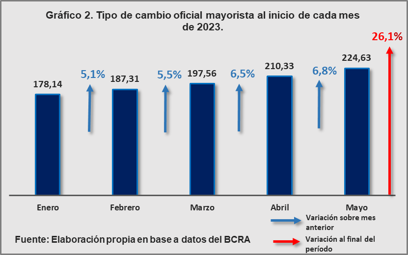 En rigor de verdad, el ritmo de la tasa de devaluación es un dato que se mantiene en secreto. Revelarlo indicaría la dirección en la que se orienta la política cambiaria del BCRA, con riesgo de perder poder de sorpresa sobre el mercado de divisas. Lo que se puede afirmar es que “administrar el crawl” con un fin de control de la inflación sería razonable: la devaluación alcanzó tasas más altas con cada mes del año. Hasta el inicio de mayo suma un 26,1% en total (ver Gráfico 2). Ya se tendría que saber cuáles son las consecuencias de seguir así.