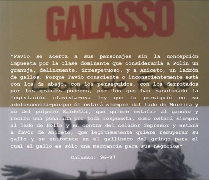 Catorce capítulos, 192 páginas, que incluyen las letras de canciones y la bibliografía a la que echó mano Galasso para ordenar y reconstruir la vida del artista popular que con su cine y sus canciones supo conquistar al pueblo no solamente argentino. Como señala Fernando Martín Peña en su presentación, otra de las virtudes del trabajo de Galasso es que “no comete el error de separar al cineasta del cantante popular y del militante sui generis que ciertamente fue”. En las páginas recorre los años negros de la dictadura, su exilio como el de tantos artistas, la vuelta de la democracia y su crítica al radicalismo. Luego su película Gatica, el Mono, en 1993, durante la presidencia de Carlos Menem que Favio sin dudar critica: “Con el menemismo se han quebrado los puentes entre la base y la dirigencia”. La decisión de retirar su película para la selección de los Oscar en 1994, para presionar que se apruebe la ley de cine que dormía en los cajones desde hacía dos años, produce el efecto deseado: la ley se aprueba.