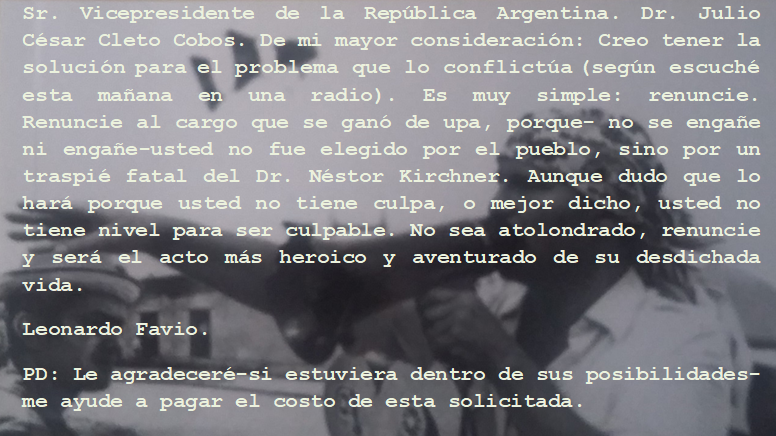 Su “odio como se debe a la oligarquía”, que no oculta, lo ratificará en el conflicto por la resolución 125 de retenciones móviles, cuando el presidente del Senado, el entonces Vicepresidente Julio Cleto Cobos, vota contra el gobierno del que forma parte. Entonces Favio, indignado por esa traición publica, difunde una solicitada que el libro rescata: