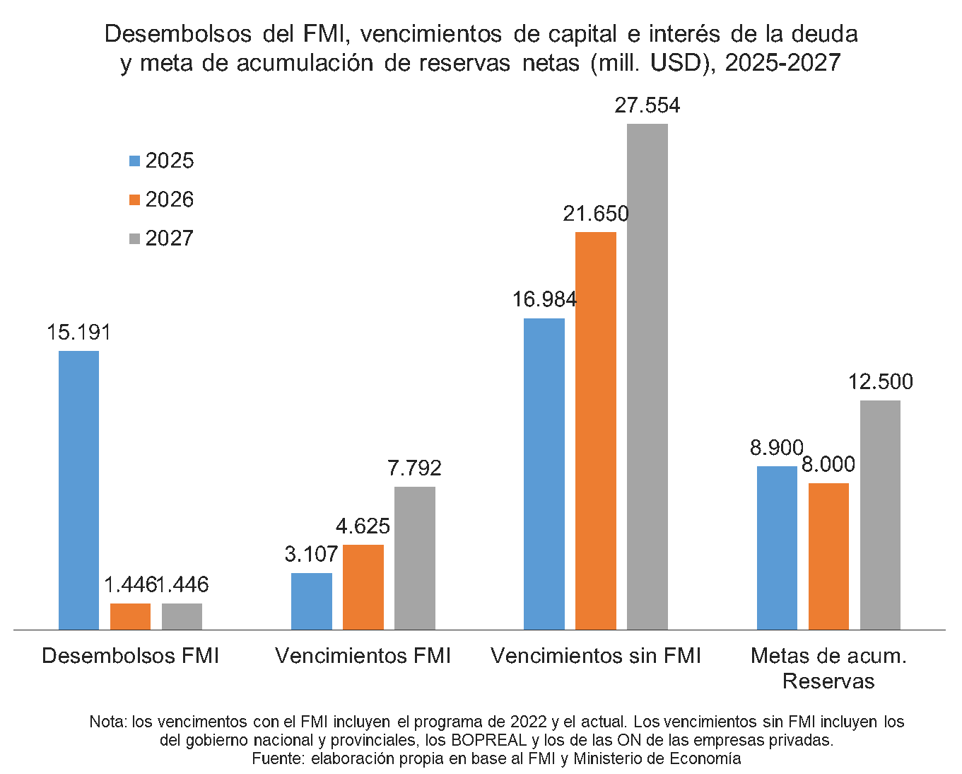 Si se logra pasar la tormenta este año, la piedra en el zapato va a apretar más fuerte en los próximos a pesar de los cuatro años y medio de gracia del programa actual: en 2026 y 2027 los desembolsos serán de apenas 1.446 millones de dólares frente a vencimientos con y sin FMI por 26.275 y 35.345 millones de dólares, respectivamente. A eso se suma la necesidad de acumular reservas netas por 8.000 y 12.500 millones de dólares, según las metas del acuerdo.
