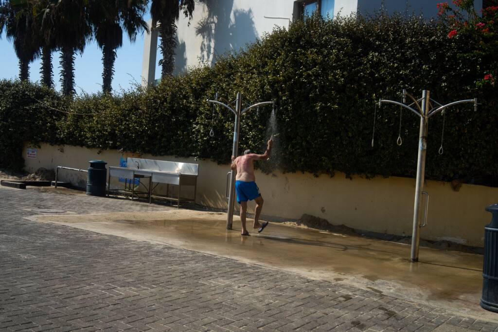 Es finales de julio de 2025, pleno verano en Israel, y Dor disfruta del domingo con normalidad. La playa está abarrotada y el flujo de familias y turistas es intenso. Banderas israelíes por todas partes. Jihan habla a pocos metros de unas grandes duchas, instaladas frente al banco de arena. Un hombre de unos 70 años, en pantalones cortos, chanclas y sin camisa, se acerca a las duchas. Tira del cordón y suelta litros de agua. Repite el gesto y se baña una, dos, tres, diez veces, mientras nos observa.