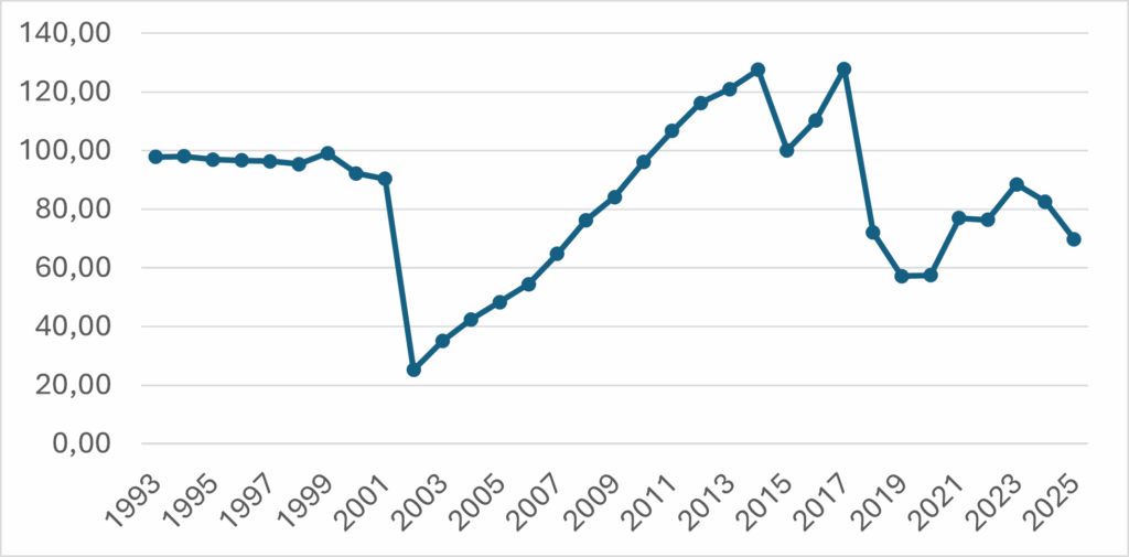 Por otro lado, los datos de la Función Defensa reflejan también la caída significativa de los recursos, pero con el agravante de que esta apertura muestra la inversión específica para las operaciones, adiestramiento, sostenimiento y alistamiento de las Fuerzas Armadas [4]. Si consideramos como valor 100 al año 1989, podemos observar que, hasta el 10 de diciembre de este año, el devengado representó solo el 69,79% de lo invertido con relación al último año del Presidente Raúl Alfonsín (1983-1989)[5] en términos reales. Si bien el gobierno proyecta un aumento en el proyecto de ley que envió al Congreso de la Nación, teniendo presente lo ocurrido durante el presente año, la visión es más bien pesimista para el año 2026.