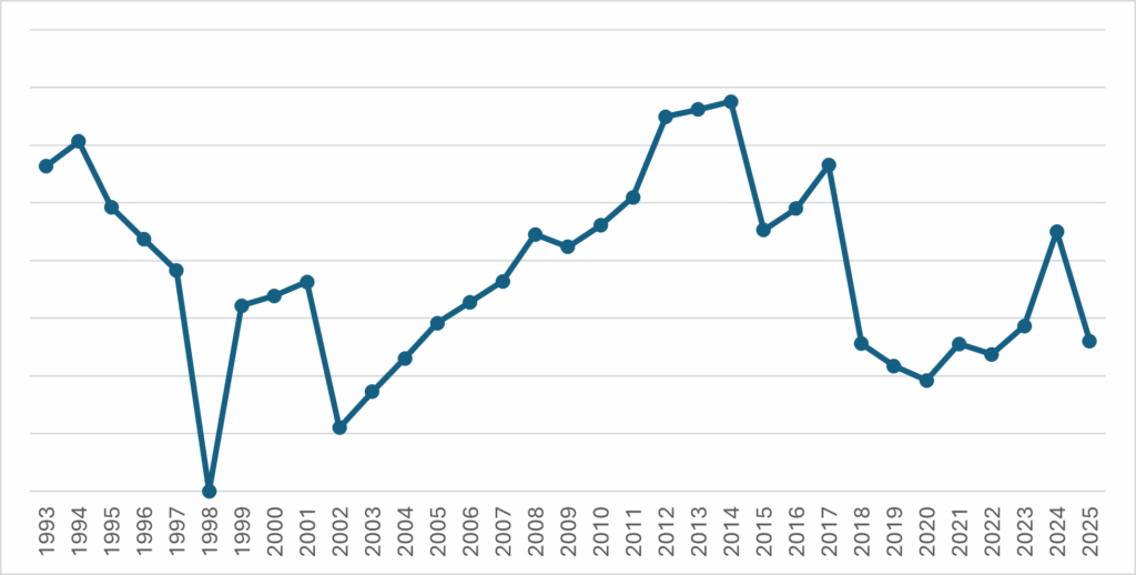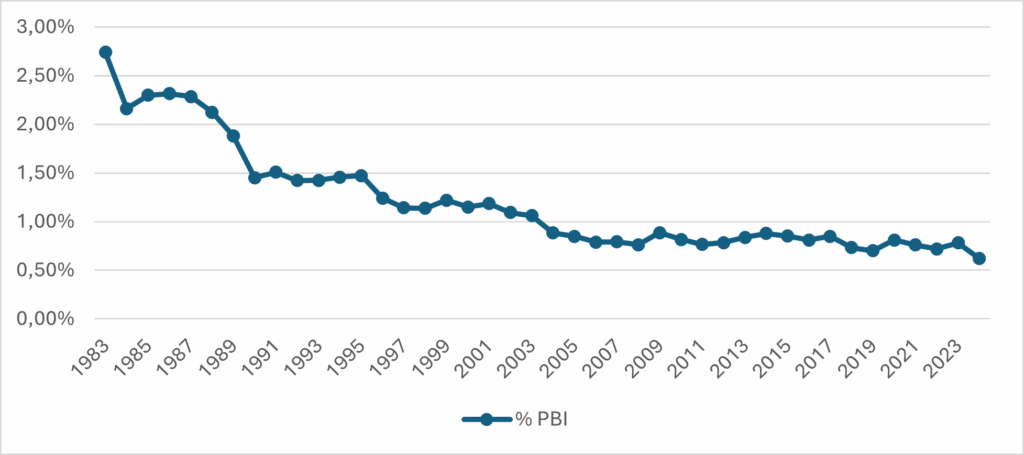 Los dos gráficos precedentes merecen una breve explicación. En primer lugar, los datos del Stockholm International Peace Research Institute (SIPRI) corresponden al total del Ministerio de Defensa, que incluye las funciones de defensa, salud, seguridad social, inteligencia, ciencia y tecnología, transporte y educación. En otras palabras, abarca más que lo que muestra la función defensa. Asimismo, el dato del año 2024, publicado en abril de 2025, corresponde a la prórroga del presupuesto realizada a inicios de ese año, lo cual será ajustado en la publicación que realizará esta institución en abril de 2026.