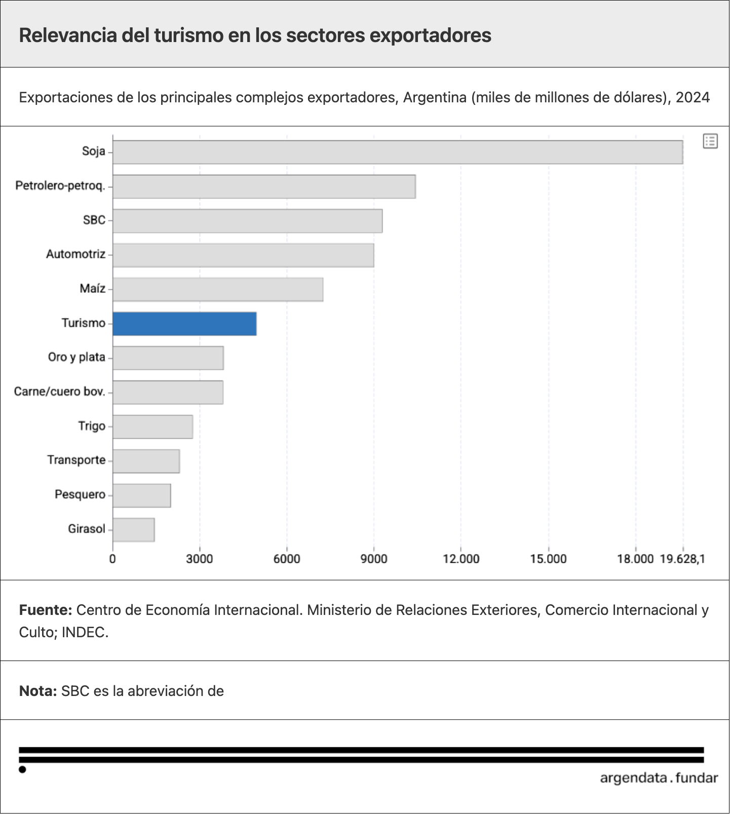 Durante 2024, el turismo generó casi 5.000 millones de dólares de exportación. Así, se posicionó en el sexto lugar dentro de los complejos exportadores de bienes y servicios (por detrás del sojero, del petrolero-petroquímico, del de servicios basados en conocimiento, del automotriz y del maicero).