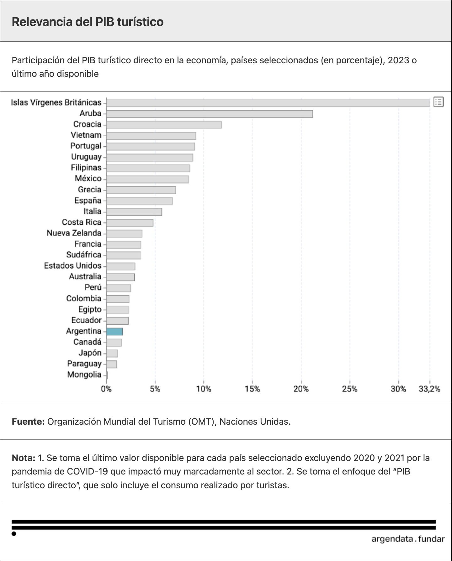 El PIB turístico directo representa el 1,7% del total en Argentina. Entre los 125 países con datos disponibles, el país se ubica en el puesto 110 en cuanto al peso del turismo en la economía.