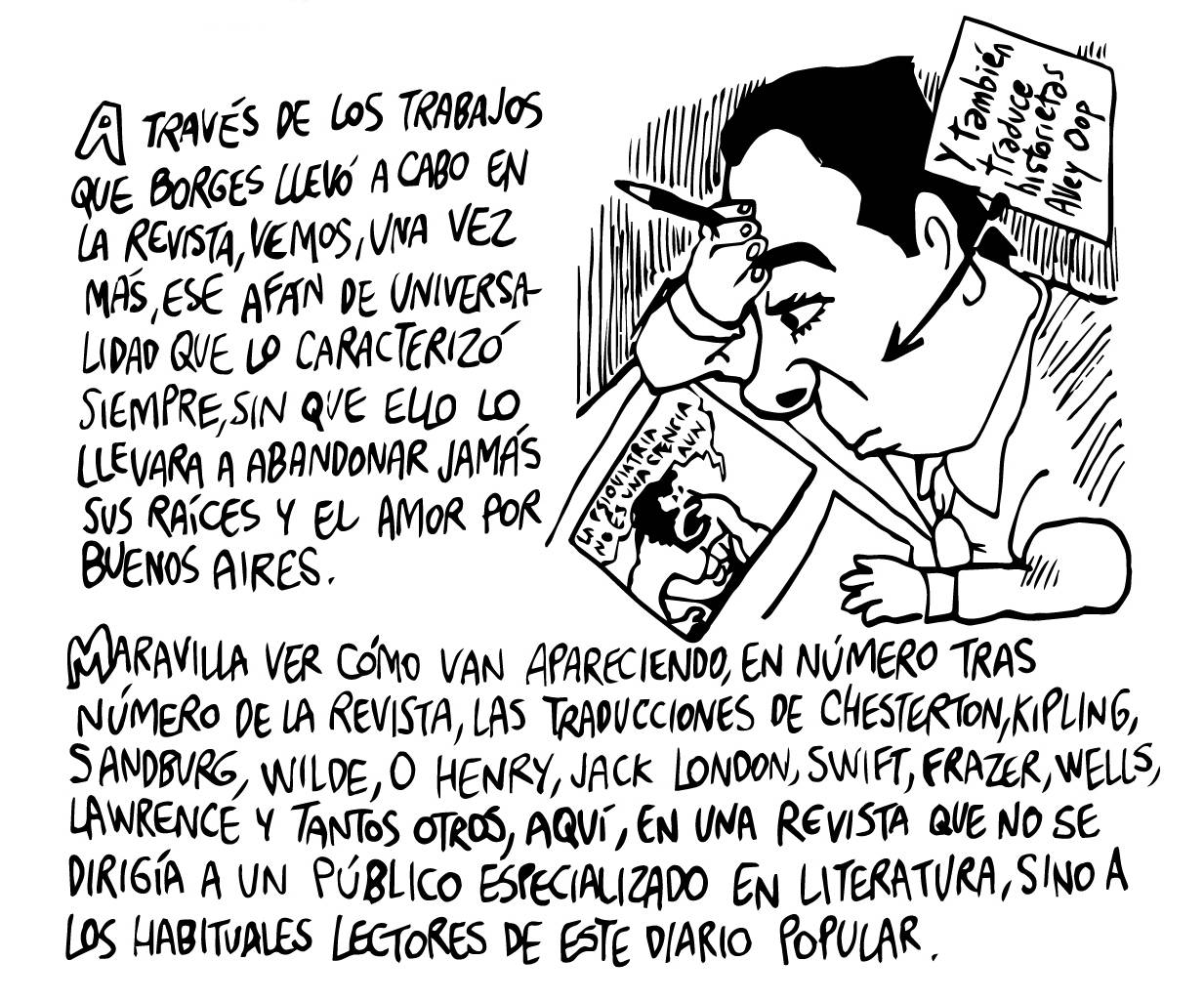 A la prosa delicada y de diccionario generoso de Abdala, el dibujante Rep le comparte ilustraciones a veces en función de notas al pie. Cuando Abdala despliega el alcance de la celebridad del escritor, el artista muestra un Borges sin rostro junto a una dama –que es Mafalda adulta— dentro de una suerte de serpiente inflable; deja abierto si una u otra se trata de Emma Zunz. Mientras el hombre dice: “Estoy harto de hablar de Borges”, la mujer señala: “Pero podría ser peor. Podría hablar de fútbol, u otras disciplinas innobles”, locución aludible a Leonor Acevedo, la madre. Rep brinda acotaciones pertinentes, coadyuvantes al desarrollo del texto, valiéndose de una diversificación de su estilo acostumbrado. Desarrolla varios trazos, cada tanto mediante líneas sólidas que parecen esfumarse; se aproxima y se aleja de la caricatura, aún dentro del mismo cuadro, juega con el raspado propio del sombreado sin el objeto que la proyecte, acota con respeto el rasgo disonante: al pie del árbol de raíces figurativas y ramaje etéreo atribuido a Villa Ocampo –Mar del Plata, residencia estival de Victoria—, un cartelito mínimo anuncia: “Aquí meó Borges”. Son acotaciones indirectas, esta vez sin referencia explícita a un texto central de por sí descontracturado; vibración suplementaria acaso destinada a la confluencia propia del ritmo cardíaco proveniente de los soportes textuales y gráficos.