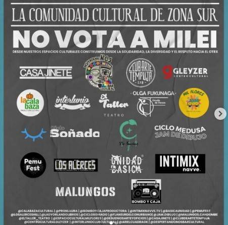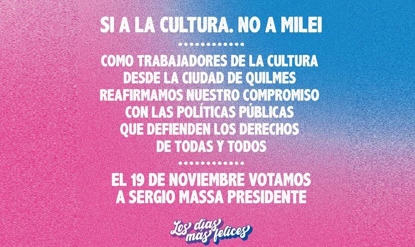 Desde Quilmes, más de medio millar de trabajadores de la cultura suscribieron una “declaración por la democracia; en defensa de las políticas públicas que garantizan los derechos de todas y todos, entendiendo la importancia de la jornada del 19 de noviembre, donde se definirá un proyecto de país. Quienes abrazamos la cultura como herramienta transformadora decidimos apoyar a Sergio Massa”.