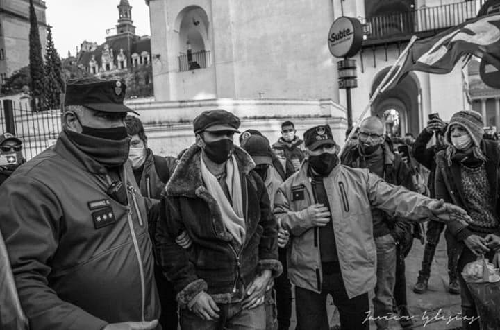 Uniformados que no tienen relación con la Bonaerense hacen causa común. Durante una movilización hacia Plaza de Mayo por la desaparición forzada de Facundo Castro, la Policía de la Ciudad se lo llevó detenido hasta una dependencia en Floresta por escribir con aerosol en el Cabildo. No se supo que hubiera otras detenciones durante la movilización de derecha en que se atacó a la prensa.