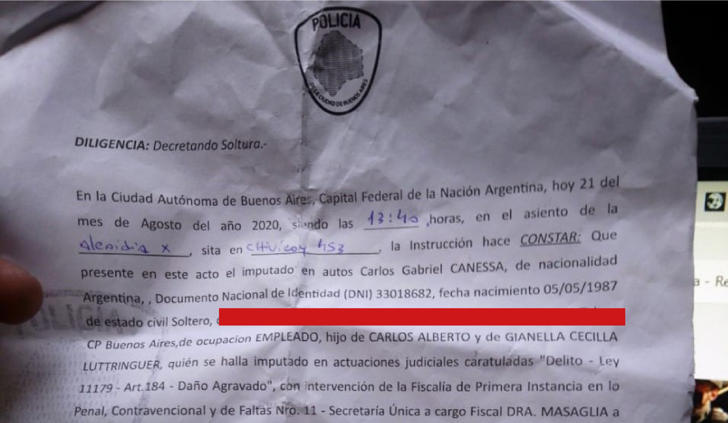 Luego de su liberación (“soltura”, dice la diligencia oficial), El Cohete se comunicó con Carlos Gabriel Canessa. Este artista que se gana la vida en un hotel, milita en Convergencia Socialista y, con autorización de su abogado Pablo Paolini, le dijo a este medio: “Fui detenido a la Alcadía 10 de Floresta. ¡Estuve 18 horas por pintar una pared! En la Fiscalía me sacaron fotos con barbijo y sin barbijo, con boina y sin boina, con bufanda y sin bufanda... hasta escaneo de retinas. Me dijeron que las fotos las pedían ‘las altas cúpulas’. El legista que tomó las fotos me dijo, como desligándose, que ese procedimiento no era necesario para la Policía. Todavía estoy esperando notificaciones, me imputaron daños agravados”.