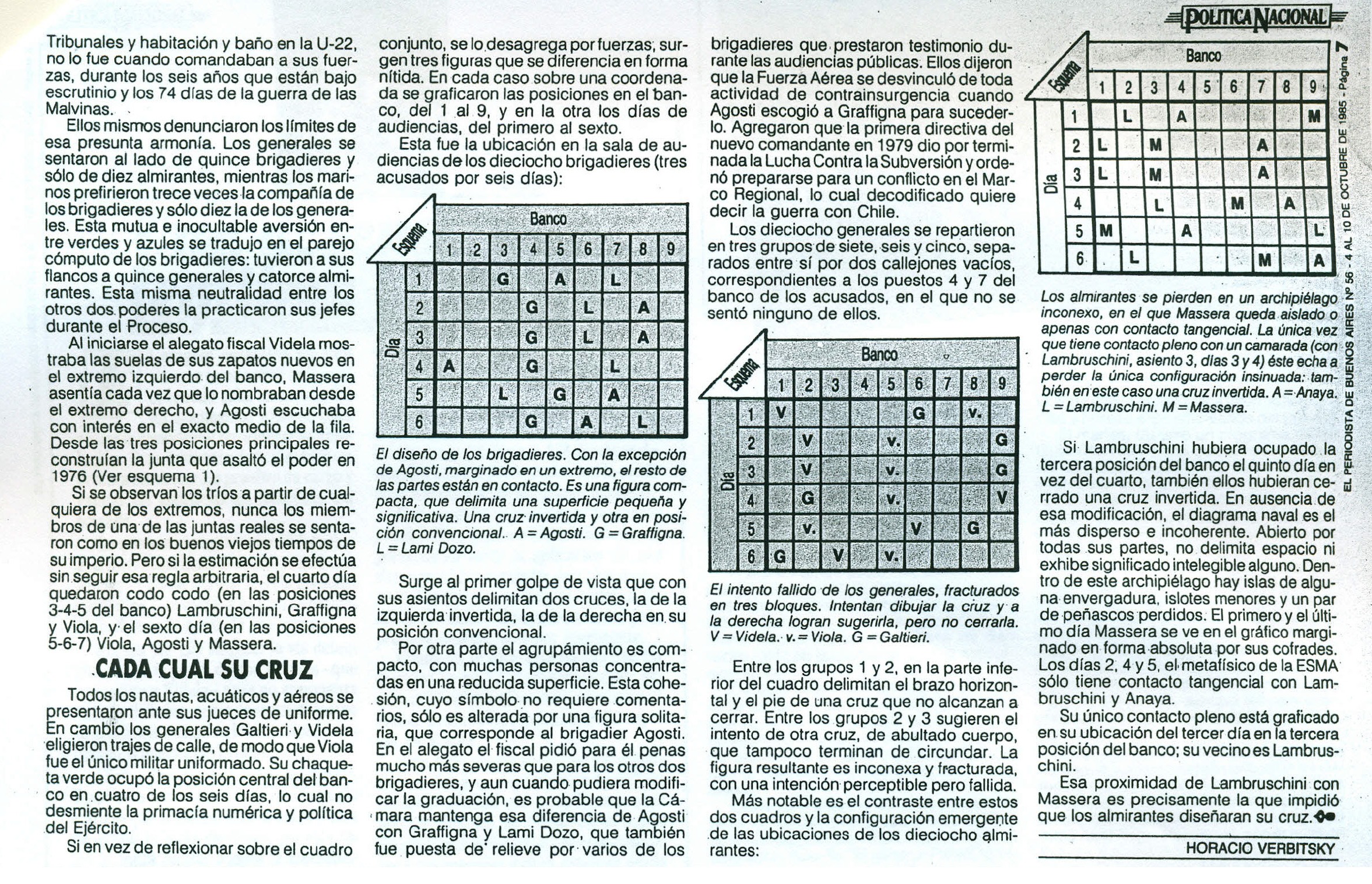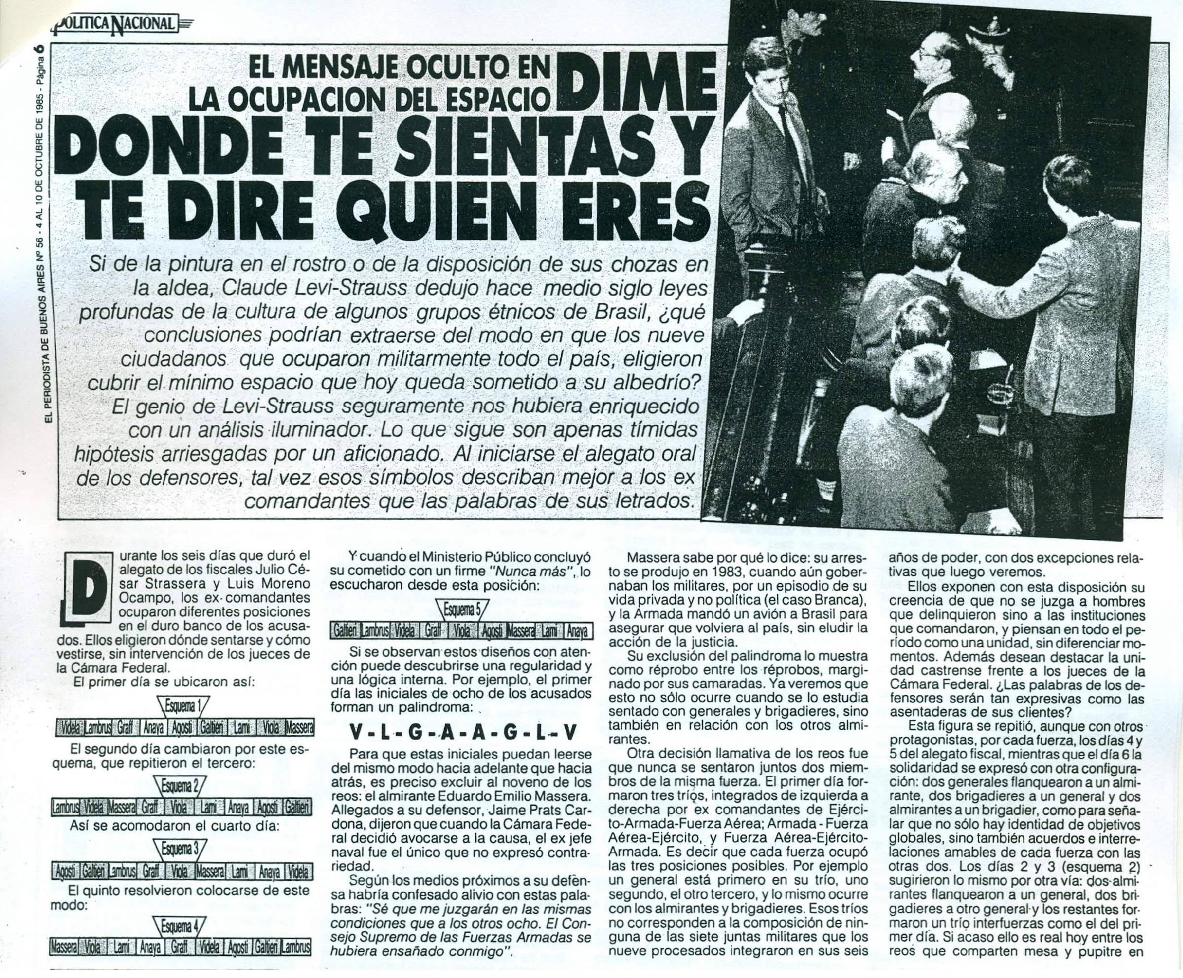 Uno de estos colegas había reparado en el orden de los acusados en el banquillo: “Hubo un cambio de ubicación. De derecha a izquierda, vistos desde el público, se sentaron Galtieri, Agosti, Anaya, Lami Dozo, Viola, Graffigna, Massera, Videla y Lambruschini”.