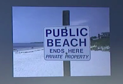 —Si eres lo suficientemente suertudo como para poseer una playa privada y quieres impedir que la gente la use, puedes poner el cartel de la izquierda.