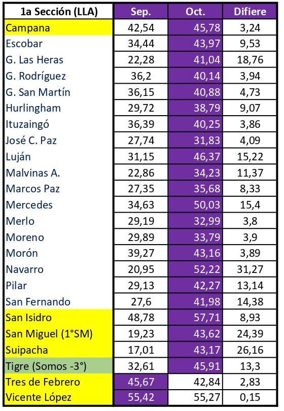 Para lo demás, El Cohete aporta un detalle de los 43 distritos del Conurbano, en las dos secciones más pobladas y con más incidencia para modificar resultados. La primera comparación es entre los porcentajes brutos de septiembre a octubre. La segunda, más fina, entre los votos. En ambos, se calcularon las diferencias y se remarcó con el color característico el frente beneficiado.