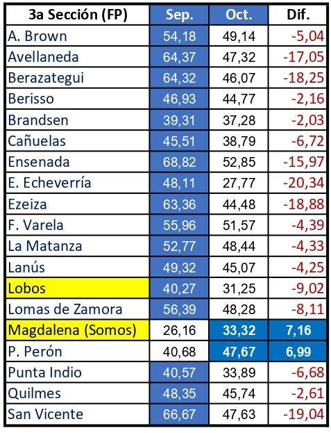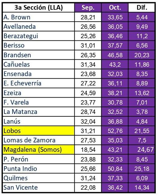 En cambio, un par de distritos chicos tuvo un crecimiento que promedió los siete puntos: Presidente Perón —que eligiera como jefa comunal a Blanca Cantero—, y Magdalena, donde gobierna un radical que ganó la legislativa del mes anterior desde la entente de Somos BA.
