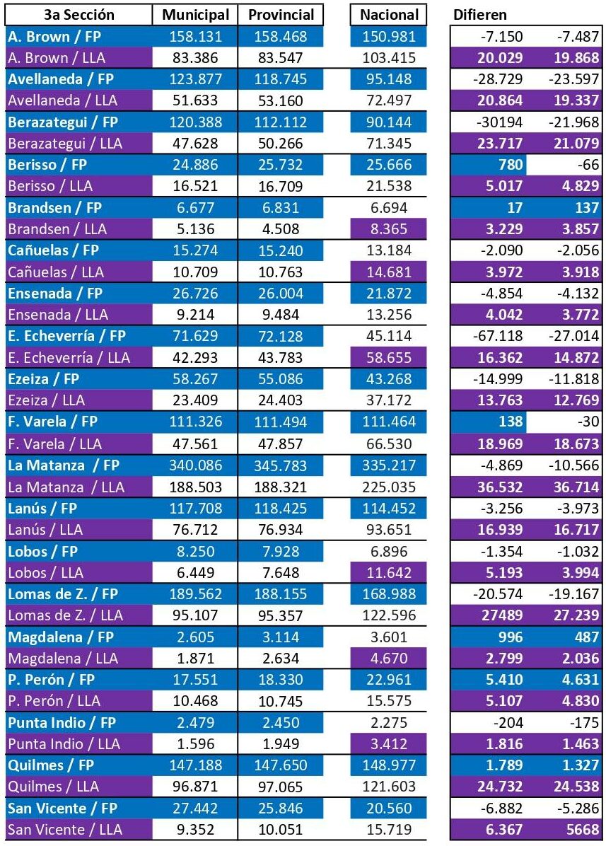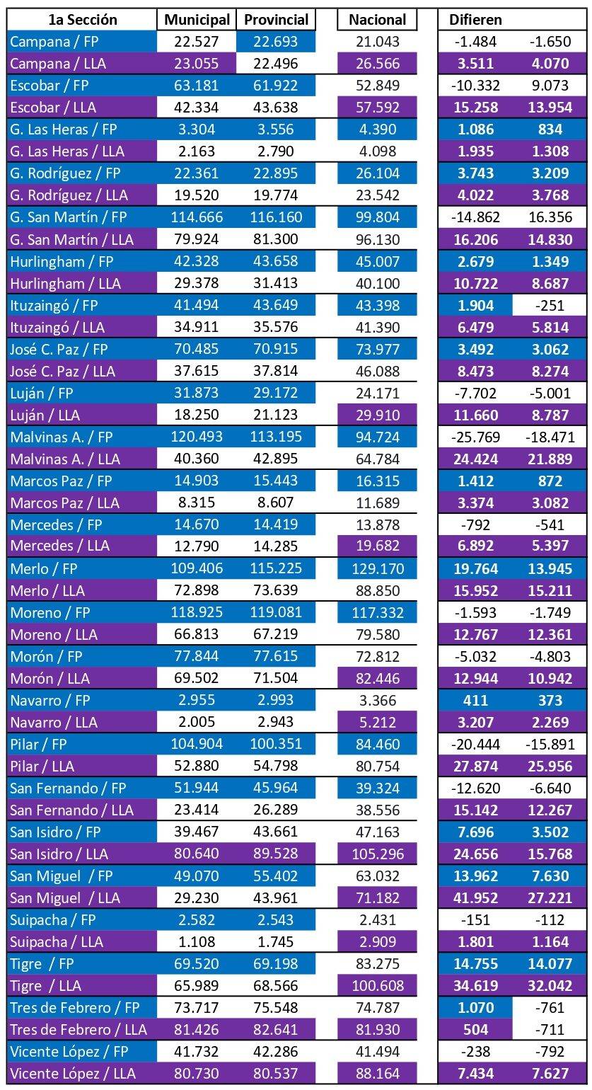 A grosso modo se aprecia que desde seis distritos se fugaron entre 16 y 20 puntos: Ensenada, Avellaneda, Berazategui, Ezeiza, San Vicente y E. Echeverría. Son los gobernados por los peronistas Mario Secco, Jorge Ferraresi, Juan J. Mussi, Gastón Granados (h), Nicolás Mantegazza y Fernando Grey, que judicializó al PJ y no integró Fuerza Patria.