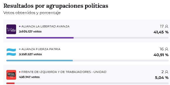 Así, el oficialismo bonaerense quedó clamando por “medio puntito” o 46.600 votos de diferencia entre LLA (3.605.127) y FP (3.558.527). Importa reparar en los del FIT (438.747; había obtenido 353.287 en septiembre) y Provincias Unidas (212.959).