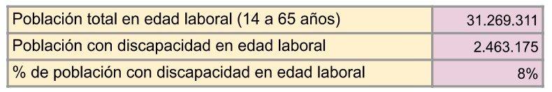Hoy ya hay estadísticas producidas por el INDEC, a partir de los censos de población y vivienda y de estudios específicos sobre discapacidad (ENDI, Encuesta Nacional de Discapacidad). Gracias a ello estamos en condiciones de proponer y fundamentar un cupo que refleje el peso de las personas con discapacidad en edad laboral en el conjunto de la población en dicho rango etario, que, según el INDEC, es la población económicamente activa de entre 14 y 65 años de edad. Ese porcentaje, como muestra el siguiente cuadro, es del 8% de esta población.
