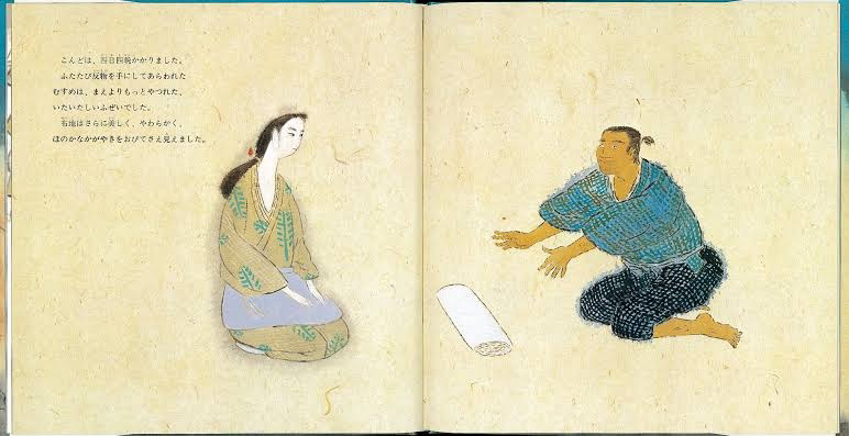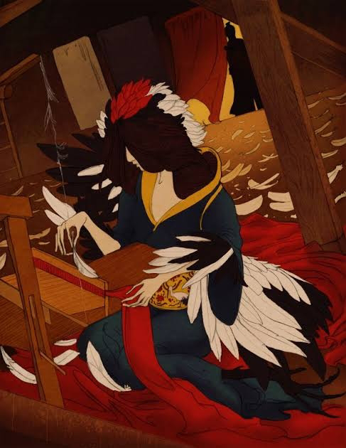 La mujer le pide al campesino que no la observe mientras trabaja, necesita hacerlo sin testigos. El hombre se lo concede. Ella se aplica entonces a la tarea y termina entregándole un tejido que el campesino vende, a cambio de una pequeña fortuna. Engolosinado, la presiona para que teja más. Pero, como además de codicioso es curioso —o, si prefieren, incapaz de respetar la voluntad ajena—, decide espiar a la mujer mientras teje. Y descubre que se trata de la grulla que había salvado, que adquirió forma humana para devolverle el favor. Decidida a enriquecer el tejido, el ave usaba sus propias plumas además de hilo: se las arrancaba, aun a pesar de que eso la desangrase y debilitase. Pero al ver expuesta su identidad —o, si prefieren, al entender que su marido no era digno del sacrificio—, le dice que ya no podrá permanecer allí y levanta vuelo, para nunca más volver.