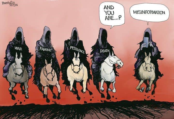 Una viñeta que encontré esta semana grafica este dilema con humor macabro. Muestra a los cuatro Jinetes del Apocalipsis en plena cabalgata: Guerra, Hambre, Pestilencia y Muerte. Sorprendida por la irrupción de un quinto Jinete, que galopa celular en mano, la Muerte le pregunta: "¿Y vos serías...?" A lo que el recién llegado responde: "Mala Información".