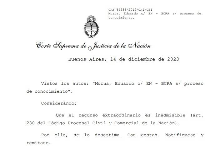 La Corte Suprema desestimó el recurso extraordinario apelando al artículo 280 del Código Procesal Civil y Comercial de la Nación, que desde inicios de la década menemista la habilita a resolver a discrecionalidad y bajo la sola invocación de la norma, en abierta contradicción con la Ley de Ética de la Función Pública que marca como deber de todo funcionario “fundar sus actos”.