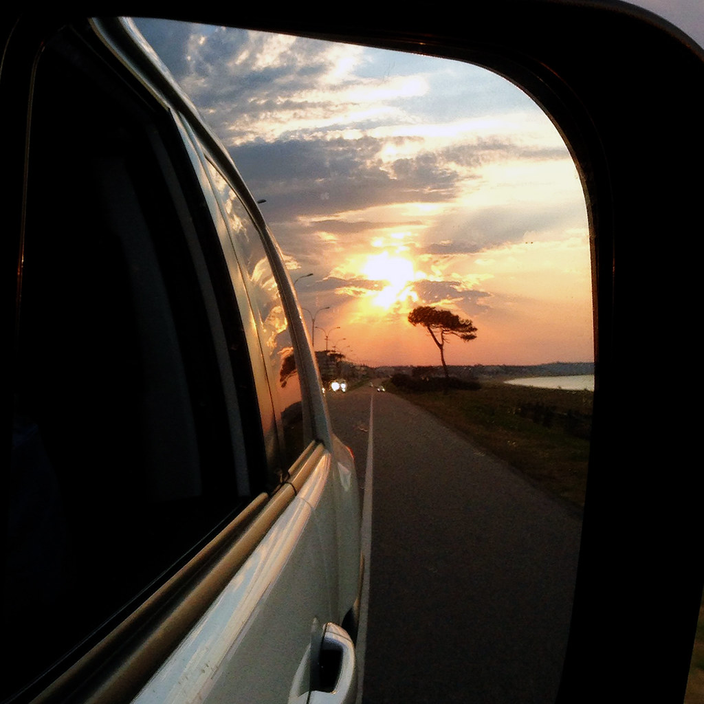 Un viaje en auto, una familia. Desde la vera del río Uruguay, al Norte, atravesando el paisito hasta un balneario que bien puede ser Atlántida, La Paloma, el Polonio, por ahí. Maneja el padre, la mamá ceba mate. En el asiento de atrás, los hijos. Tres niñas, un varón. Quien relata es la del medio que, como corresponde, va sentada al medio. Después intercambian. Cada doscientos kilómetros, más o menos, dos de los botijas, a su turno, ocupan las ventanillas. Se pelean, cuentan postes y vacas, se duermen, se despiertan, mastican una empanada. La narradora vomita. Se detienen a estirar las piernas bajo unos eucaliptos; aprovechan  para una foto.
