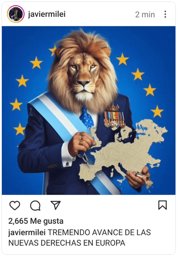 El Presidente Milei publicó en su cuenta personal de X un texto bajo el título “Tremendo avance de las nuevas derechas en Europa”, donde festeja los resultados de la jornada electoral del pasado 9 de junio en el Parlamento Europeo. “Las nuevas derechas han arrasado en las elecciones europeas y le han puesto un freno a todos aquellos que empujan la Agenda 2030, una agenda inhumana diseñada por burócratas, para beneficio de burócratas”, señaló en el posteo. Luego, en el tono mesiánico que lo caracteriza, añadió que en su visita al Foro de Davos ya había alertado “que, de continuar este rumbo, Occidente se encaminaba a su extinción. Los pueblos de Europa han hablado y han revalidado con su voto nuestra visión, a pesar de los llantos de los progresistas locales e internacionales, periodistas y políticos que cuestionaron el nuevo posicionamiento de la Argentina para disfrazar sus intenciones globalistas”.