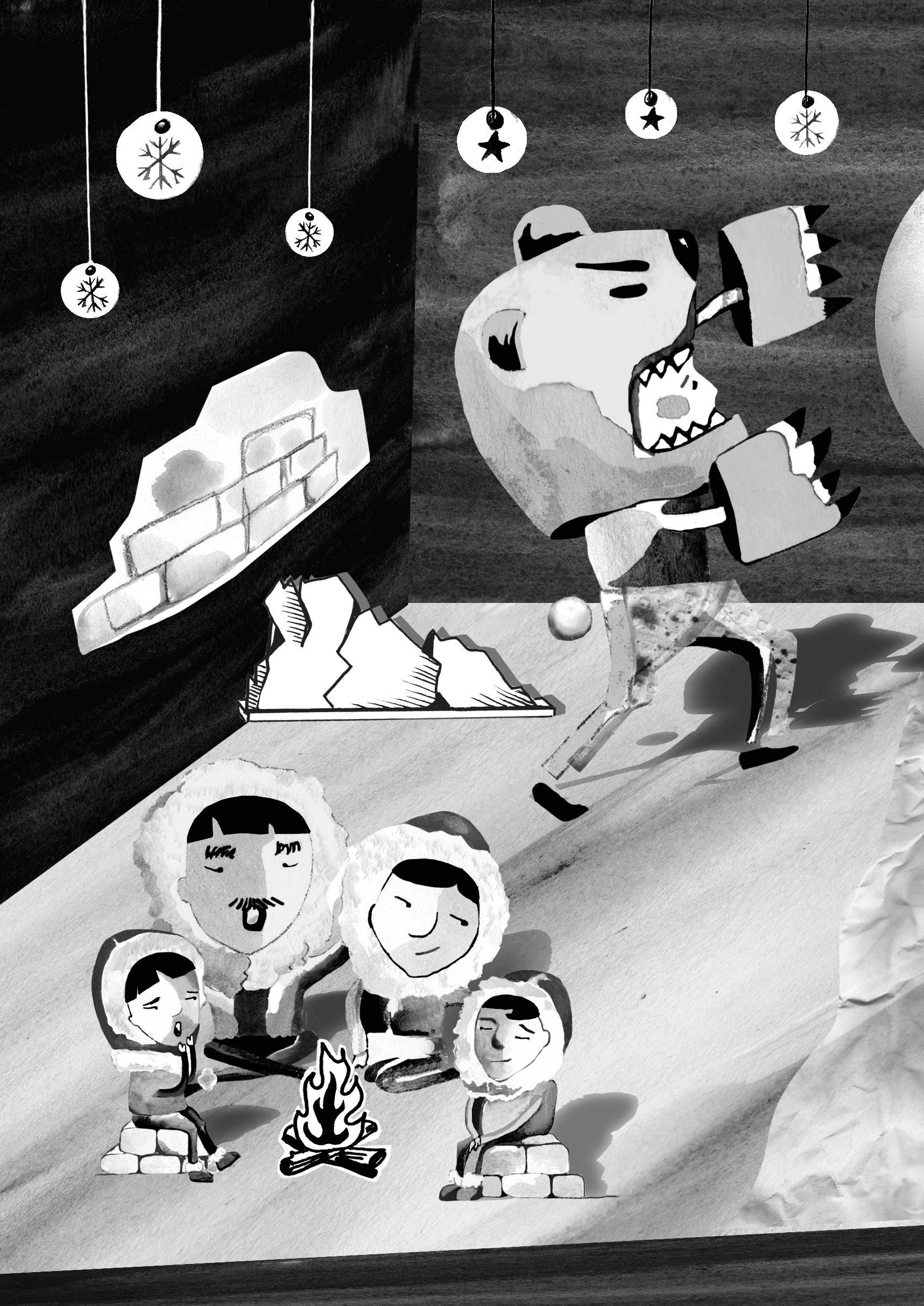 Así, “la rojísima historia del color rojo” (no hay versión “colorado” para la purretada del Newman), como no podía ser de otra manera, muestra las peripecias de un Diablo tímido que está enamoradísimo de Rubilda, vendedora de la manzanas de difícil sí. El Acto Blanco, segundo de la saga, transcurre entre esquimales quienes, como habitantes de “un lugar donde las noches duran seis meses, si no quieren morir de pena, deben temer un tesoro de cuentos”. Como se debe en estas situaciones, todo es blanco: el oso polar, el lobo, la luna en su cuatro fases, la nieve, que en su conjunto construyen un auténtico mito de origen.