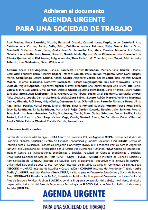 Este martes en el Hotel Castelar se presentó la “Agenda Urgente para una Sociedad de Trabajo”. Este documento fue realizado por un grupo de investigadores y especialistas en relaciones laborales y el mundo del trabajo, junto a la Fundación Friedrich Ebert perteneciente al partido socialdemócrata alemán. El objetivo fue elaborar un diagnóstico sobre el escenario que hoy se observa en el mercado de trabajo; y desarrollar, a partir de esa evaluación, un conjunto de trece propuestas concretas que contribuyan a solucionar sus principales dificultades. El encuentro encabezado por Carlos Tomada y Dörte Wollrad contó con la participación de Mercedes Marcó del Pont, Hugo Yasky, Sergio Palazzo, Mariana González, Mara Ruiz Malec y Marina Salzmann.
