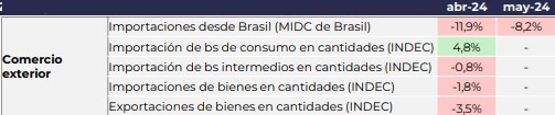 Como se observa en el informe de Intercambio Comercial de INDEC, en los primeros cuatro meses de 2024 las importaciones asociadas a bienes intermedios y bienes de capital, que hacen a la actividad industrial, se desplomaron 21,5% y 15,5% respectivamente. El propio cuadro que publica el Presidente muestra la caída en bienes intermedios en cantidades (-0,8% en abril).