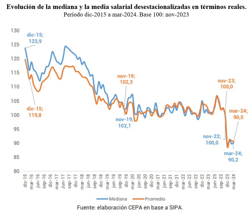 Pero haciendo un análisis más profundo, es importante entender de dónde surge la divergencia. Para ello, es imprescindible entender cómo se calcula el RIPTE. Este indicador se define como la remuneración promedio sujeta a aportes al Sistema Integrado Previsional Argentino (SIPA) de los trabajadores en relación de dependencia que han sido declarados de manera continua durante los últimos 13 meses. Es decir, utiliza como referencia el tope máximo sujeto a aporte, que se define por resolución de ANSES. Este monto varió de acuerdo a la fórmula previsional de marzo (+27,18%) y luego, por el DNU de Milei, volvió a subir en abril (+27,4%), que mensualizó el aumento de las jubilaciones (desde ahora en adelante, tendrá variación todos los meses). Esto significa que una parte de la suba del RIPTE está explicada por aumentos salariales pero otra por los incrementos de los topes en marzo y abril asociados a la fórmula jubilatoria. Si miramos el SIPA (promedio de todos los registrados privados) tanto en su mediana como en su promedio, del mismo modo que si observamos los datos de INDEC (índice de salarios para empleo registrado privado), lo que se concluye, tal como anticipamos desde CEPA, es que la caída de los salarios de diciembre y enero consolidó un nuevo piso salarial ubicándose diez puntos más abajo que en noviembre 2023.