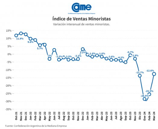A mediados de abril, en una entrevista en el programa Multiverso Fantino, Javier Milei afirmó que la economía argentina “está comenzando a recuperarse”. Para ilustrarlo, mencionó un informe de la Confederación Argentina de la Mediana Empresa (CAME) y comentó: “Cuando vos tomás el dato de ventas de CAME vas a ver una V” (ver aquí desde minuto 57:30). Los datos de dicho informe indicaban que en marzo las ventas minoristas disminuyeron un 12,6% en comparación con el mismo mes de 2023. Sin embargo, dado que en enero y febrero la caída fue aún más pronunciada, el gráfico muestra una forma de V, aunque sigue en cifras negativas. El paralelismo es muy sencillo: la economía como un ascensor que sube del décimo al noveno subsuelo. Esta declaración engañosa del Presidente se enmarca en la narrativa oficialista de fuerte recuperación.