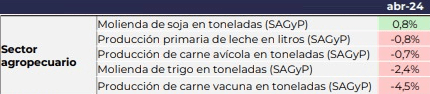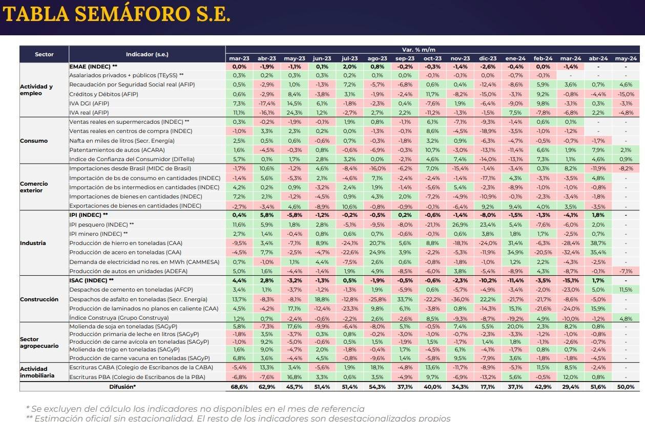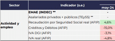 En el cuadro que sigue se ve con claridad que, en la comparación interanual, el nivel de actividad de patentamiento y producción de autos y motos, índice Construya, despachos de cemento, y la recaudación de Contribuciones Patronales, Impuesto al Cheque e IVA, se ubican significativamente más abajo que en mayo 2023 (hasta 29% alcanza la diferencia).
