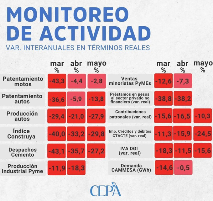 El relevamiento mensual realizado por CEPA muestra que, en términos interanuales, todos los indicadores “tempranos” de actividad muestran aún caídas muy significativas. Si bien en la variación intermensual desestacionalizada el nivel de actividad ha dejado de caer, se consolida un piso de actividad sensiblemente inferior al del año pasado.