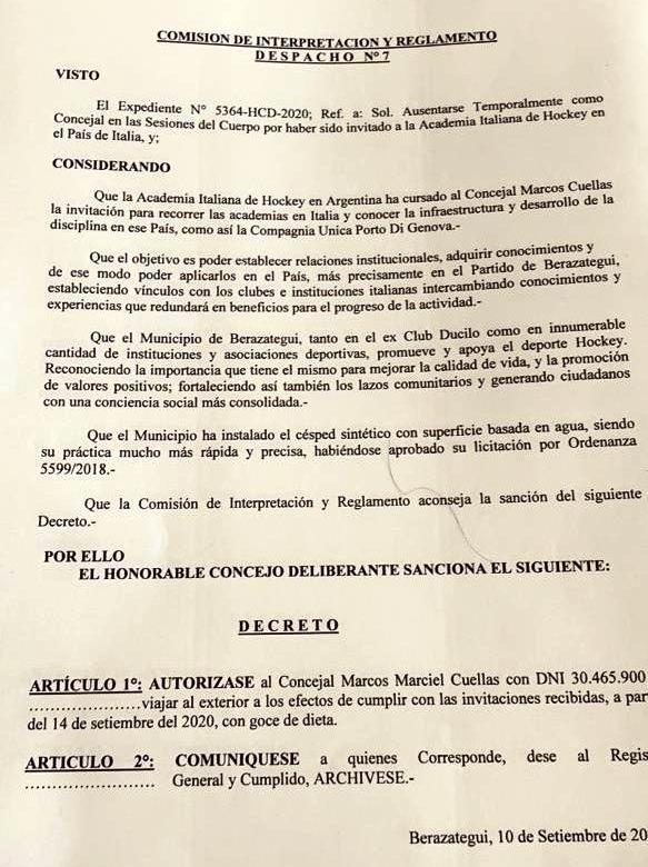 Ya en septiembre, durante una sesión, su bloque se enteró por un pedido sobre tablas (es decir, que no pasó antes por ninguna Comisión). Así se desayunaron con la pretensión del joven de irse a una Academia Italiana de Hockey en Génova, con todo pago, ya que la licencia sería “con goce de dieta”, como prueba este documento:
