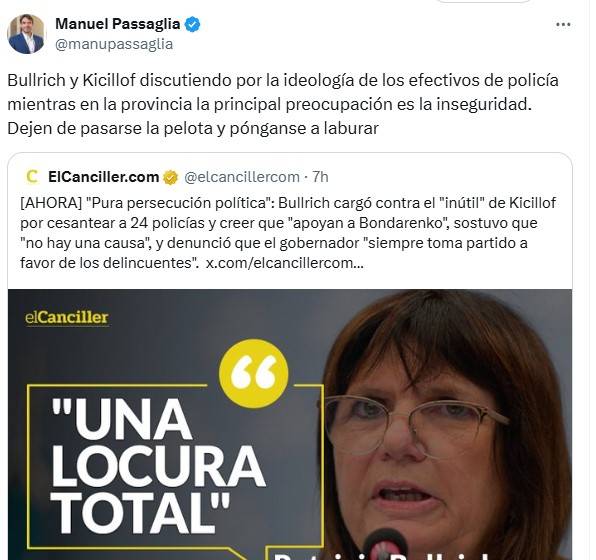 Mostrarse distinto es su objetivo. “Bullrich y Kicillof discutiendo por la ideología de los efectivos de policía mientras en la provincia la principal preocupación es la inseguridad. Dejen de pasarse la pelota y pónganse a laburar”, disparó Manuel Passaglia desde su cuenta en X.