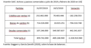 Por el otro, un proceso que se aceleró profundamente en los últimos años, donde sobre la base de un dinamismo en sus exportaciones, Vicentin SAIC se apalancó notablemente con productores, con el sistema financiero local y con acreedores externos. La empresa llegó al concurso de acreedores sin la presentación de su balance que cerró el 31 de octubre de 2019, instrumento que hasta hoy no ha podido exhibir y que induce a pensar que no puede hacerlo porque los números no cuadran con los estados contables de 2018 y con los balances de corte que se fueron presentando hasta julio de 2019. ¿Por qué no aparece el balance 2019, cuando su plazo de presentación venció en febrero de este año y cuando el concurso de acreedores no debió abrirse sin él? La respuesta a esta pregunta es explicada por un tendal de acreedores de distinta naturaleza que se encuentran con una empresa tremendamente endeudada y con un patrimonio neto que seguramente será negativo. El cuadro que sigue es elocuente al respecto: