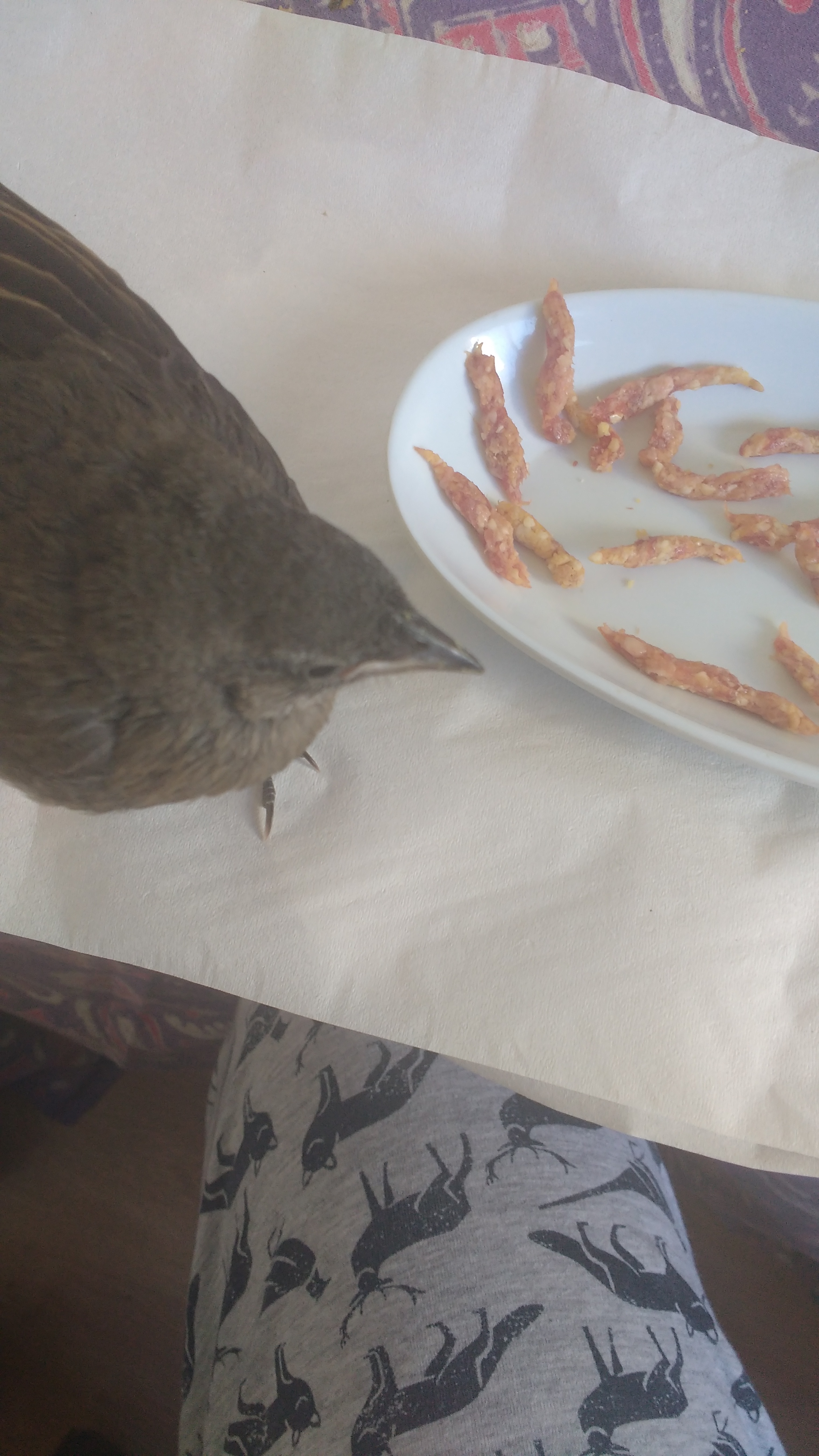 A las dos semanas de convivencia empezó a comer de otra manera. Ya no levantaba el pico ni lo desarticulaba pero tampoco era capaz de picotear la variedad de semillas que le presenté. Las miraba desconcertado, las empujaba con el pico y las abandonaba. Entonces preparé una papilla más sólida de harina de maíz y carne picada y la amasé en forma de pellets cilíndricos que le acercaba al pico uno por uno y él tragaba con avidez. Habíamos superado la etapa del sorbete, un salto evolutivo tan importante como dejar los pañales o la mamadera.