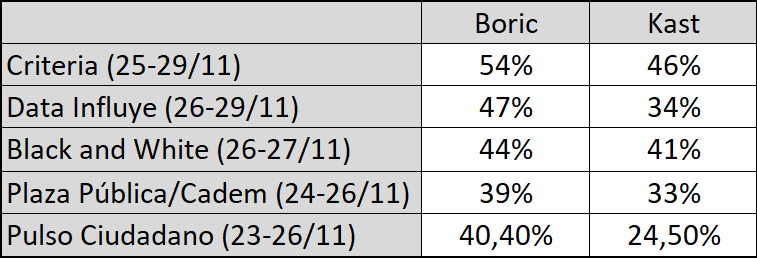 Todas lo dan ganador a Boric, lo que mostraría una reversión de lo sucedido en la elección de primera vuelta.