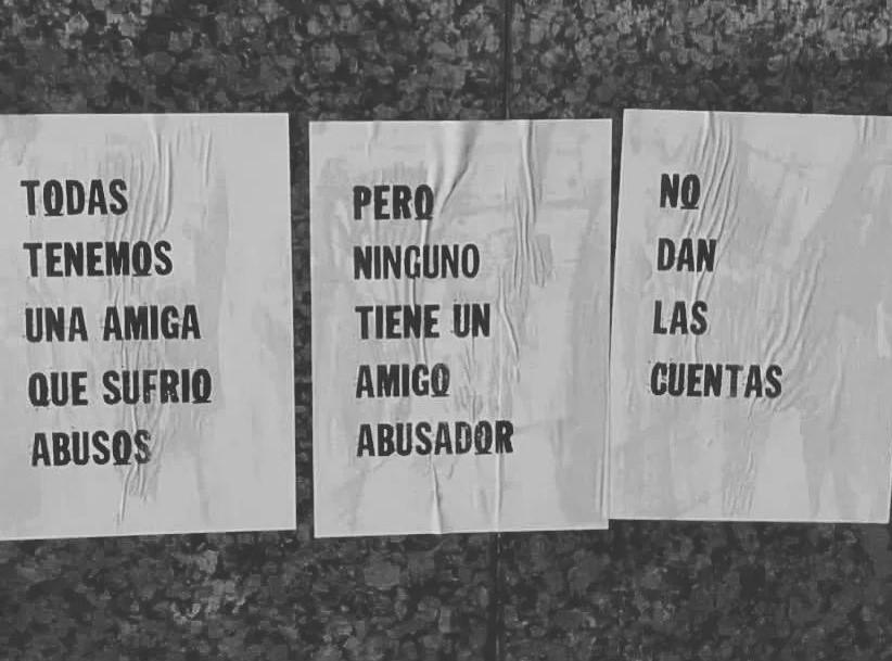 A pocas cuadras del Palacio de Tribunales, en el microcentro porteño, una piba con uniforme de colegio secundario mordiéndose el labio inferior con furia saca una foto con su celular a tres carteles pegados en la fachada de un edificio que dicen: “Todas tenemos una amiga que sufrió abusos. Pero ninguno tiene un amigo abusador. No dan las cuentas”. Dos varones de la misma edad pasan caminando a su lado. Charlan del inicio de clases. No la registran. Ni a ella, ni a los carteles que fueron colocados luego de que trascendiera el pasado lunes una violación grupal a una chica de 20 años, a la luz del día y en pleno barrio de Palermo.