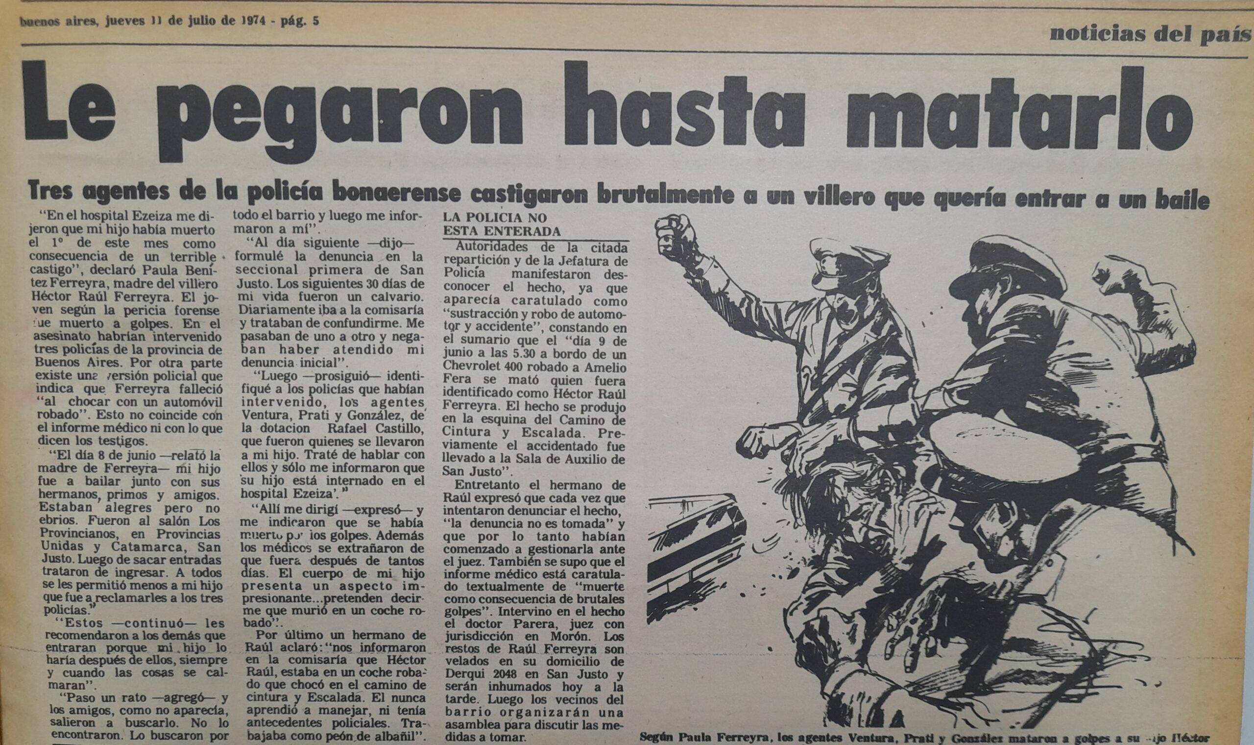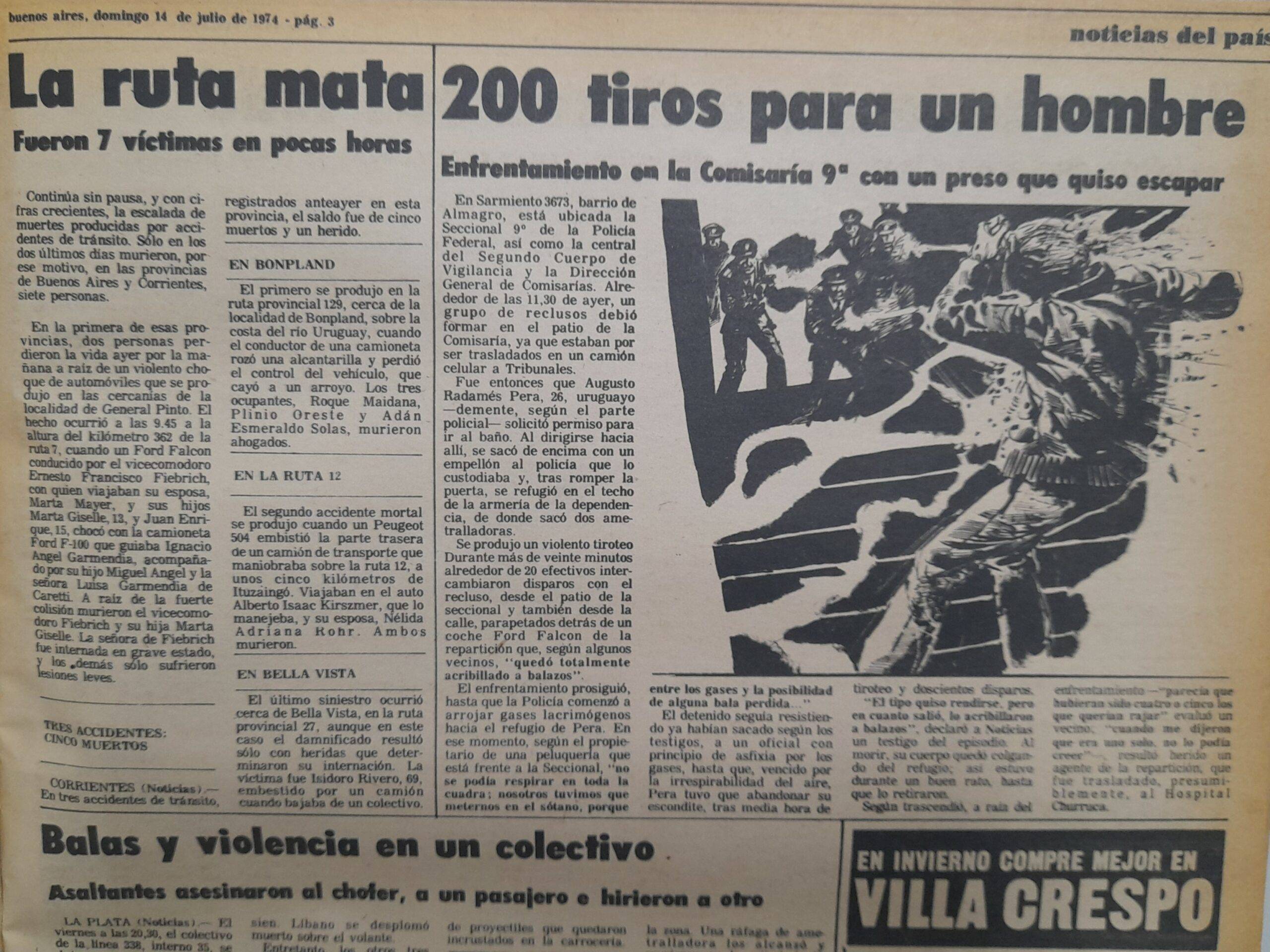 El 24 de julio, en Ciudadela, un periodista presencia la muerte de Ismael Asad, de 15 años, asesinado por un policía bonaerense. Así lo cuenta la crónica: “Eran las 10.05 de la mañana cuando esto ocurría y un cronista de Noticias llegaba casualmente al lugar del hecho, observando al policía matador, todavía apuntando al cuerpo caído con la pistola y temblando visiblemente”. Mientras La Razón, Crónica y la agencia Noticias Argentinas relatan el caso como un accidente, el diario atestigua que el policía intervino a pedido del playero de una estación de servicio que consideró sospechoso a Asad y que el menor fue asesinado de un disparo en la cabeza, por la espalda y “sin que hubiera resistencia”.