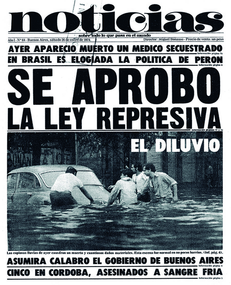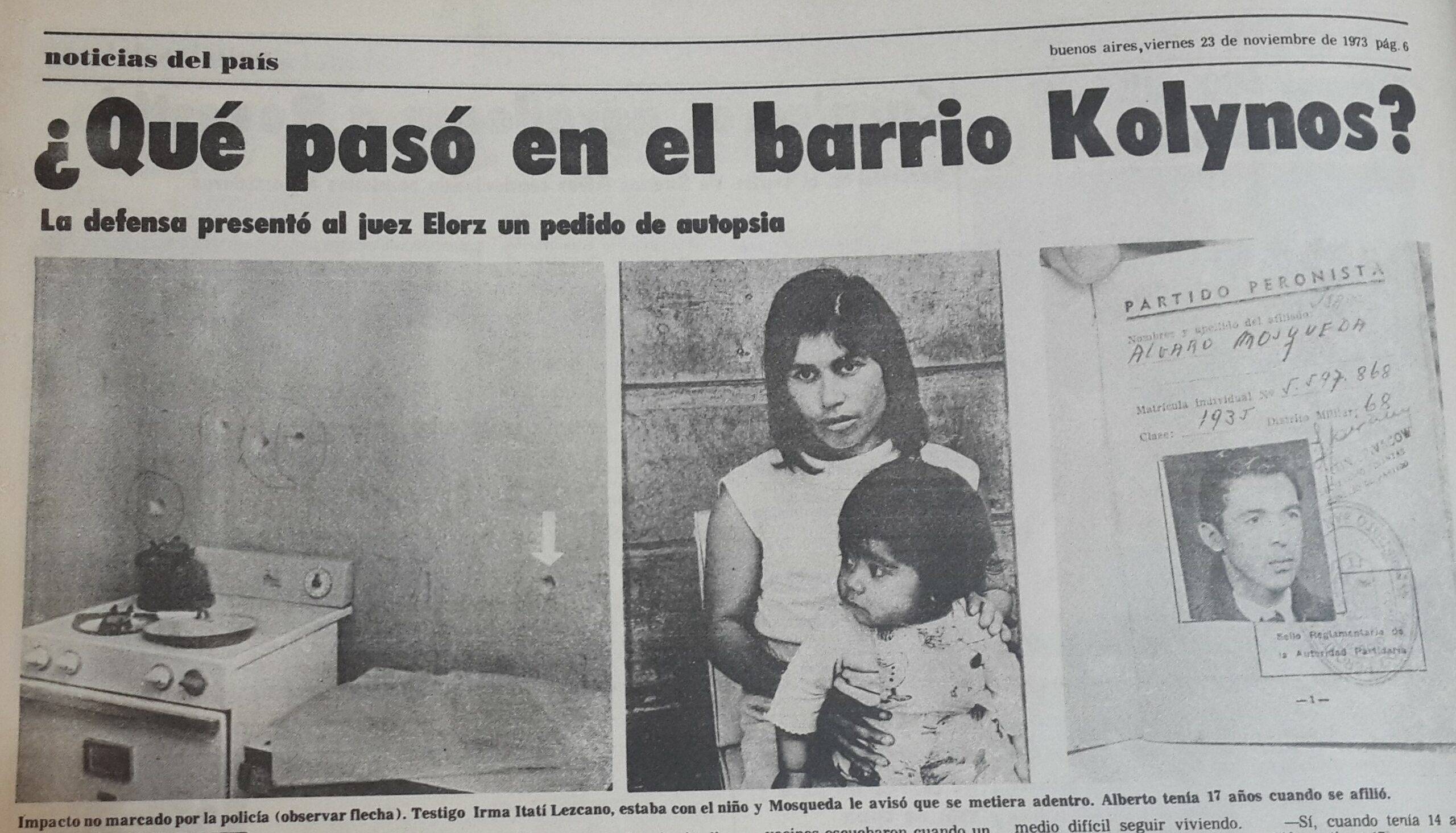 Noticias sale a la calle el 21 de noviembre de 1973 y en el primer número retoma un cuádruple homicidio perpetrado en el barrio Kolynos, de Quilmes Oeste. Isaac “Alberto” Mosqueda, militante de Montoneros de 38 años; Juan Carlos Piray, de 18 años; Juan Francisco Aristegui, de 17, y Omar José Arce, de 13, habían sido asesinados por la policía bonaerense el 2 de noviembre. A través de una serie de notas, el diario reclama por la investigación, entrevista al único testigo –un niño de 8 años— y refuta la versión policial de un enfrentamiento.